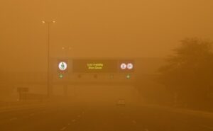 2022年3月4日,在科威特首都科威特城,汽车行驶在沙尘中。新华社发(阿萨德摄)