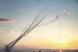 这是10月7日在加沙地带城市拉法拍摄的向以色列发射的火箭弹。新华社发(哈立德·奥马尔摄)