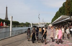 7月4日,在法国巴黎塞纳河边,模特展示法国品牌香奈儿2023/2024秋冬高级定制新品。新华社记者高静摄