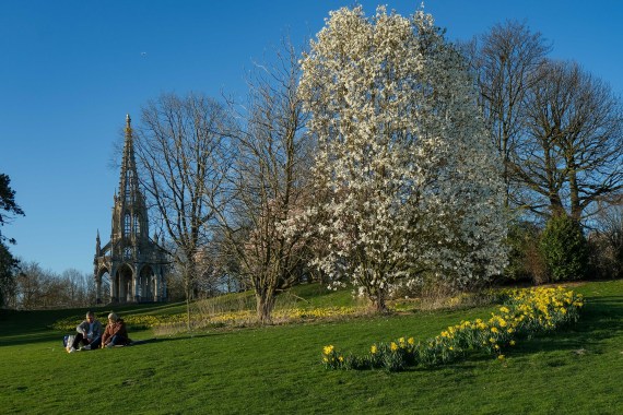 2022年3月18日,人们在比利时布鲁塞尔拉肯公园的草地上休息。(新华社记者张铖摄)