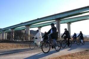 12月21日,游客们在韩国密阳市骑行游玩。新华社发(杨畅摄)