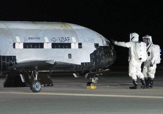 这张由美国军方发布的照片显示,2010年12月3日,技术人员在美国范登堡空军基地查看刚刚着陆的X-37B空天飞机。新华社/美联