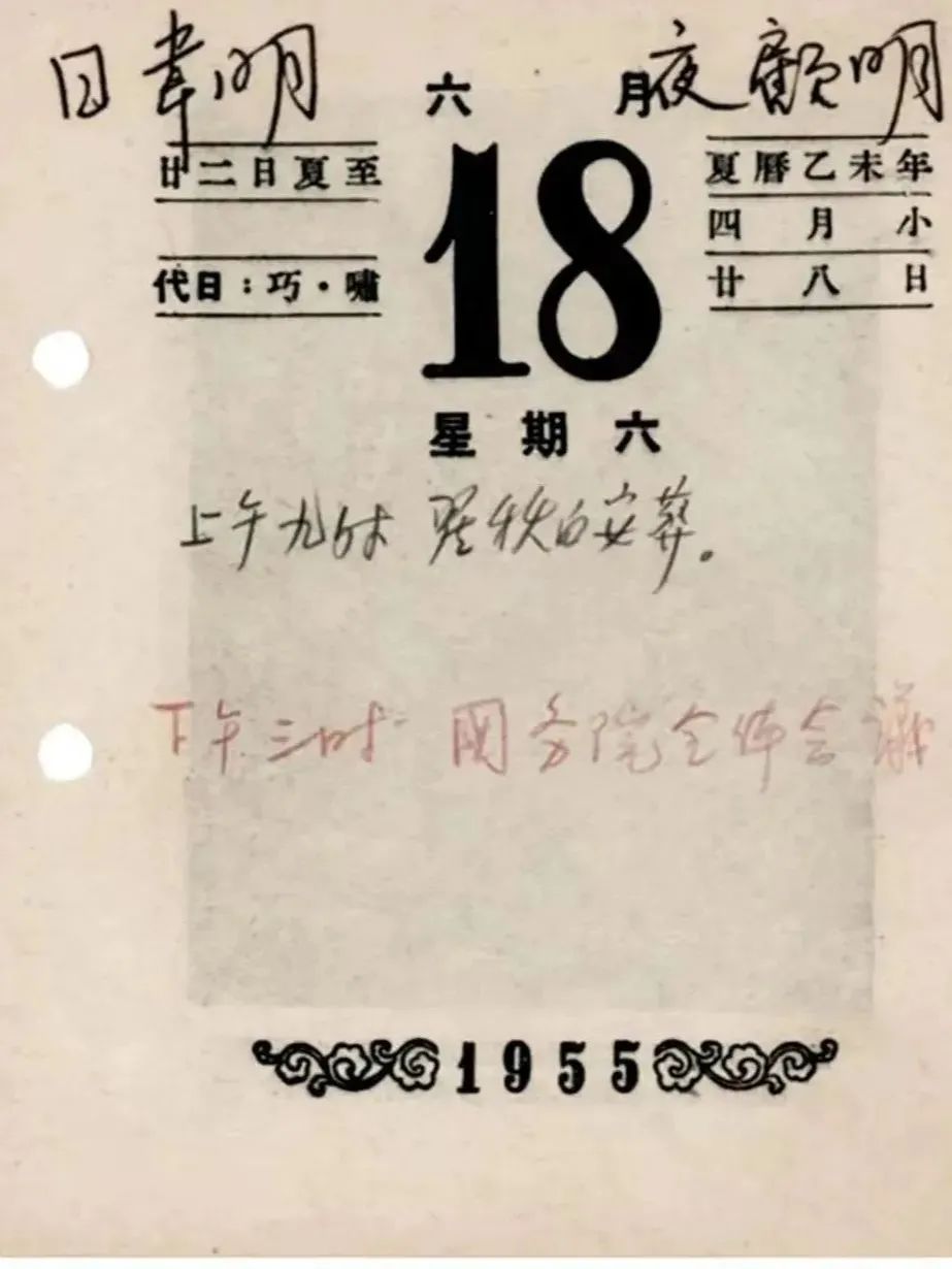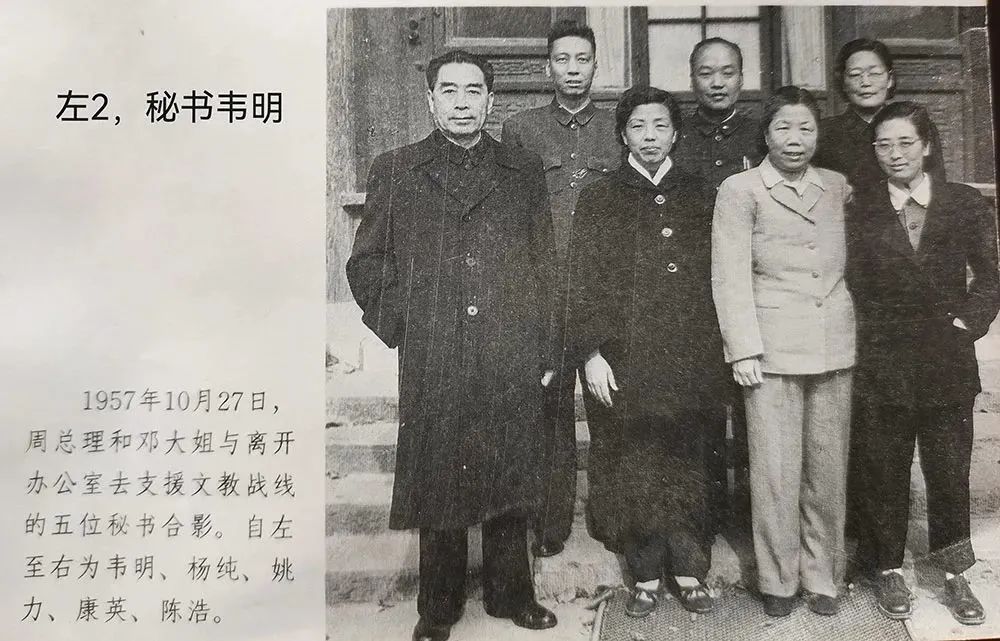 “日”为白天的日班,总理办公室的秘书分“日班”和“夜班”两班工作。“韦明”是总理秘书韦明同志,1951至1957年,担任总理的文教秘书。