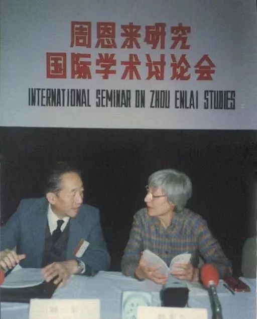 ▲1988年10月,顾明和英籍华裔作家韩素音主持“周恩来研究国际学术研讨会”(俞梅荪摄)