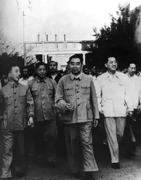 ▲1962年6月16日,周总理视察长春第一汽车制造厂。左起:饶斌(机械部部长)、黎玉(副部长)、戚剑南(后,总理秘书)、周总理、周建南(后任机械部部长)、顾明(总理秘书)