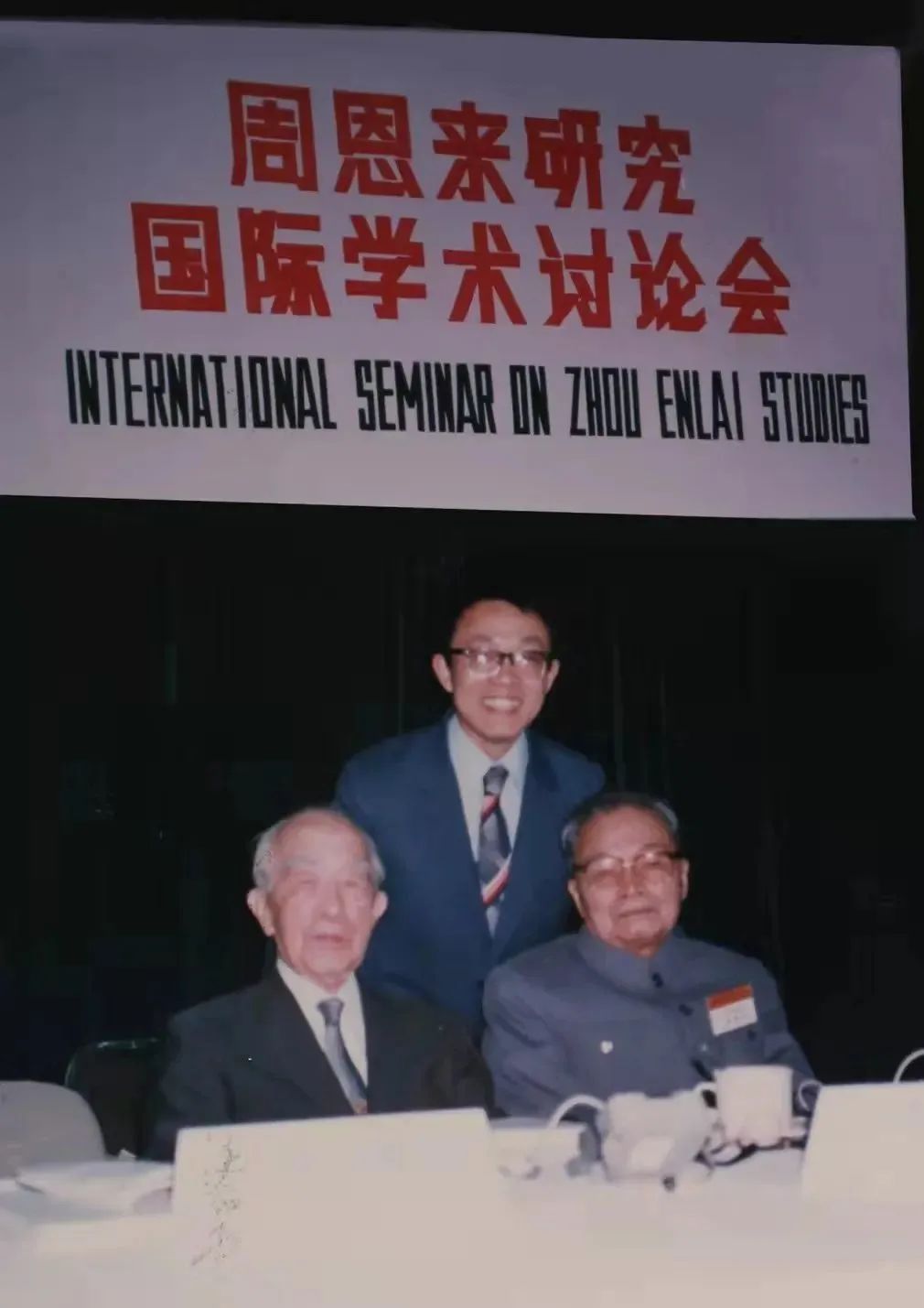 ▲1988年10月,左起冈崎嘉平太、薛暮桥、后俞梅荪,在南开大学“周恩来研究国际学术研讨会”。(薛暮桥的秘书李克穆摄)