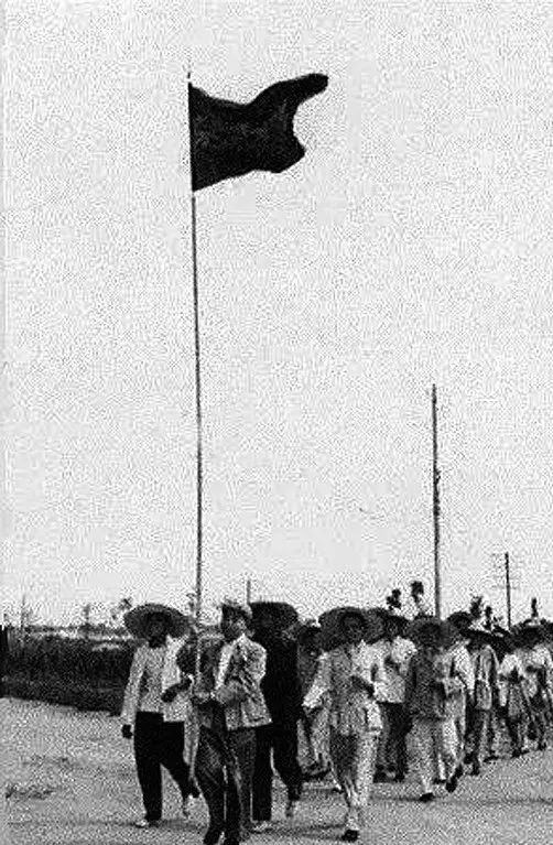 ▲1958年6月,周总理四次带队率国务院机关人员到十三陵水库工地,参加义务劳动。他高举红旗走在前列,即使健康人举大旗很费力,何况他的右臂因伤残而伸不直
