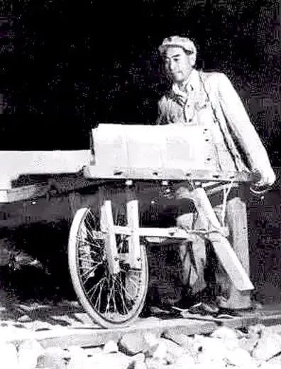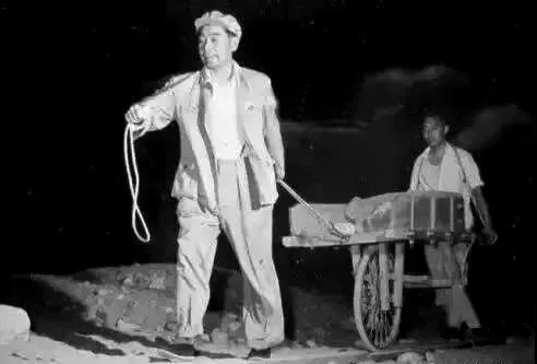 ▲在北京十三陵水库工地,周总理从早干到晚,天黑仍在拉车,卫士赵行杰在后面推着车