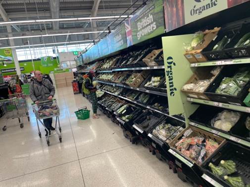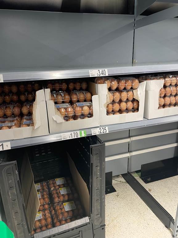家里到ASDA大约十分钟。 9:30到了ASDA,人不多,超市货架上货物充足,唯独鸡蛋专架上的鸡蛋已经所剩无几了,一早就开始清空了。 说明还有更早专门来买鸡蛋的。