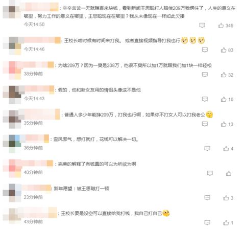 消息一出立刻迅速衝上微博熱搜第一,天價金額也讓網友不禁開玩笑表示「氣死了!良知在哪裡?拳頭又在哪裡」、「請問在哪裡蹲點」、「我第一次有想要被人打的欲望」。大批網友留言,「有錢就是囂張」、「有錢人就是不一樣,能想到提行政覆議延緩被拘,完了再找關係找人擺平」、「鈔能力」、「是我想的那個王思聰嗎」、「嚴懲,以為有幾個錢,不得了了,囂張跋扈」、「原來少爺打架不用刑拘」。