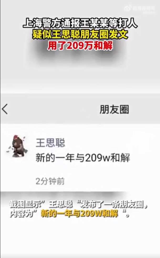 微博13日瘋傳一則疑似為王思聰所發的微信朋友圈截圖,截圖中,王思聰寫道:「新的一年與209萬和解。」令眾人聯想到他前一天才被傳毆人遭警方逮捕,該發文似乎是在透露已經砸下大筆和解金「消災」。