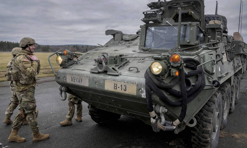 拜登政府正準備宣布向烏克蘭提供25億美元軍援計畫,此將是美國首度提供烏國史崔克裝甲車,預計移交數量近100輛。。圖為史崔克裝甲車。(美聯社)