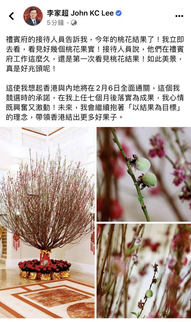 李特首接著寫道:「這使我想起香港與內地將在2月6日全面通關,這個我競選時的承諾,在我上任七個月後落實為成果,我心情。 既興奮又激動! 未來,我會繼續抱著「以結果為目標」的理念,帶領香港結出更多好果子。」