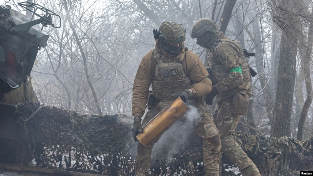 烏克蘭武裝部隊第3獨立突擊旅(亞速部隊)成員在烏克蘭頓涅茨克州巴赫穆特附近使用蘇制152毫米2A65Msta-B榴彈砲向進攻的俄軍開火。(2023年2月6日)