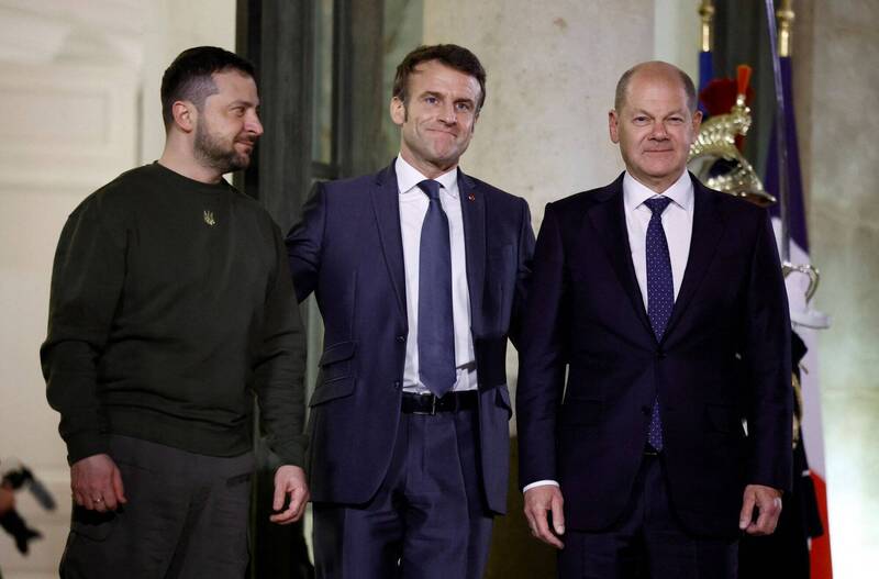 與法國總統馬克宏(中)、德國總理蕭茲(右)在巴黎會面。(路透).jpg)