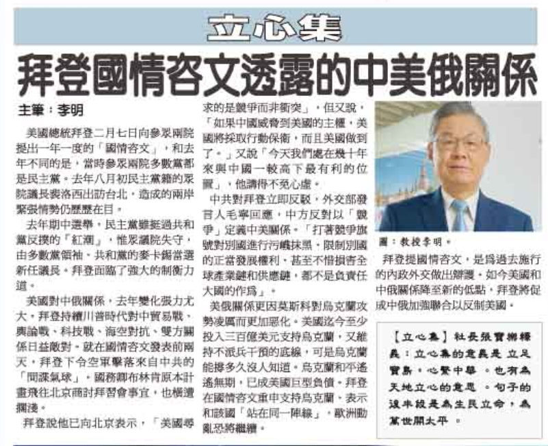 美俄關係更因莫斯科對烏克蘭攻勢凌厲而更加惡化。美國迄今至少投入三百億美元支持烏克蘭,又維持不派兵干預的底線,可是烏克蘭能撐多久沒人知道。烏克蘭和平遙遙無期,已成美國巨型負債。拜登在國情咨文重申支持烏克蘭、表示和該國「站在同一陣線」,歐洲動亂恐將繼續。