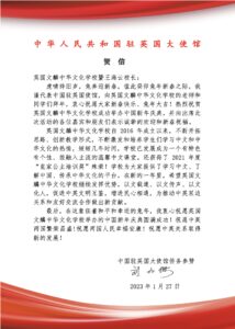 中国驻英国大使馆侨务参赞刘红梅代表使馆也发来贺信。在贺信中,刘参赞对英国文麟中华文化学校的发展表示祝贺。她在贺信中指出,文麟中华文化学校自2016年成立以来,不断开拓思路、创新教学形式,不断激发和培养学生们学习中文和中华文化的热情,短短几年时间,学校已发展成为一个有特色有个性、能融入主流的温馨中文课堂。还获得了2021年度“皇家公主培训奖”殊荣!学校为大家提供了学习中文、了解中国、传承中华文化的平台。在新的一年里,希望英国文麟中华文化学校继续发挥优势,以文载道、以文传声、以文化人,促进中英文明互鉴,增进民心相通,为推动中英双边关系和友好交流合作做出新贡献。