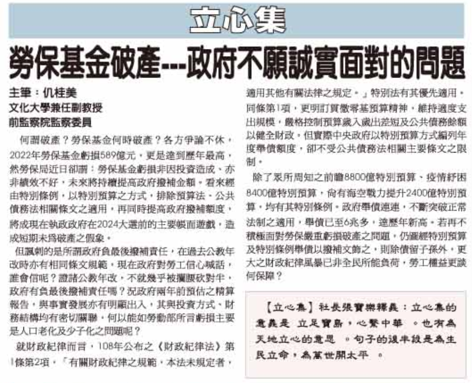 除了眾所周知之前瞻8800億特別預算、疫情紓困8400億特別預算,尚有海空戰力提升2400億特別預算,均有其特別條例。政府舉債連連,不斷突破正常法制之適用,舉債已至6兆多,達歷年新高。若再不積極面對勞保嚴重虧損破產之問題,仍圖經特別預算及特別條例舉債以撥補文飾之,則除債留子孫外,更大之財政紀律風暴已非全民所能負荷,勞工權益更談何保障?