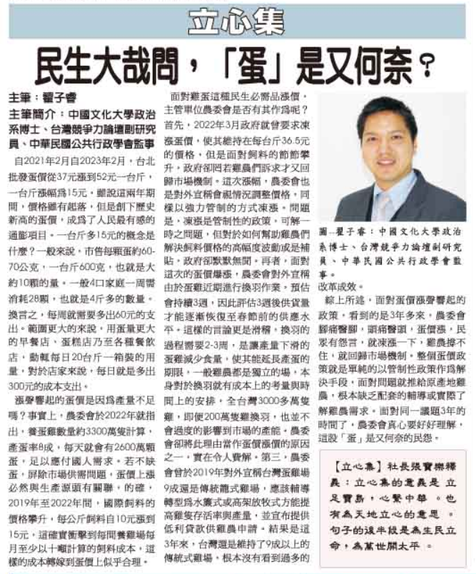 綜上所述,面對蛋價漲聲響起的政策,看到的是3年多來,農委會腳痛醫腳,頭痛醫頭,蛋價漲,民眾有怨言,就凍漲一下,雞農撐不住,就回歸市場機制。