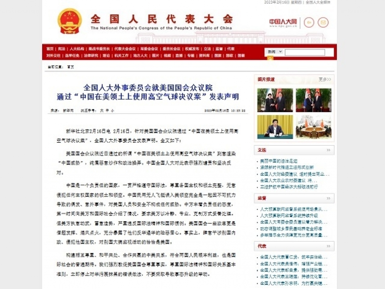 全國人大外事委員會發表聲明,批評美國國會眾議院近日通過的所謂「中國在美領土上使用高空氣球決議案」刻意渲染中國威脅,純屬惡意炒作和政治操弄。中國全國人大對此表示強烈譴責和堅決反對。