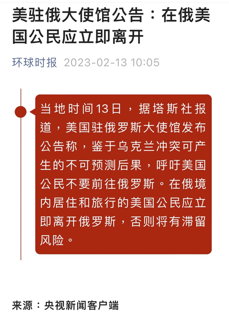 短短数百字的内容指,「当地时间13日,据塔斯社报道,美国驻俄罗斯大使馆发布公告称,鉴于乌克兰冲突可产生的不可预测后果,呼吁美国公民不要前往俄罗斯。 在俄境内居住和旅行的美国公民应立即离开俄罗斯,否则将有滞留风险。」 但报道没有点出为什么驻俄美馆要发这公告的背后原因。