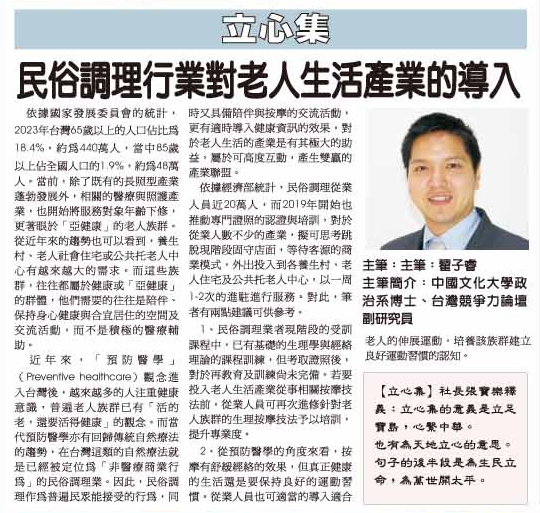 依據經濟部統計,民俗調理從業人員近20萬人,而2019年開始也推動專門證照的認證與培訓,對於從業人數不少的產業,擬可思考跳脫現階段固守店面,等待客源的商業模式,外出投入到各養生村、老人住宅及公共托老人中心,以一周1-2次的進駐進行服務。