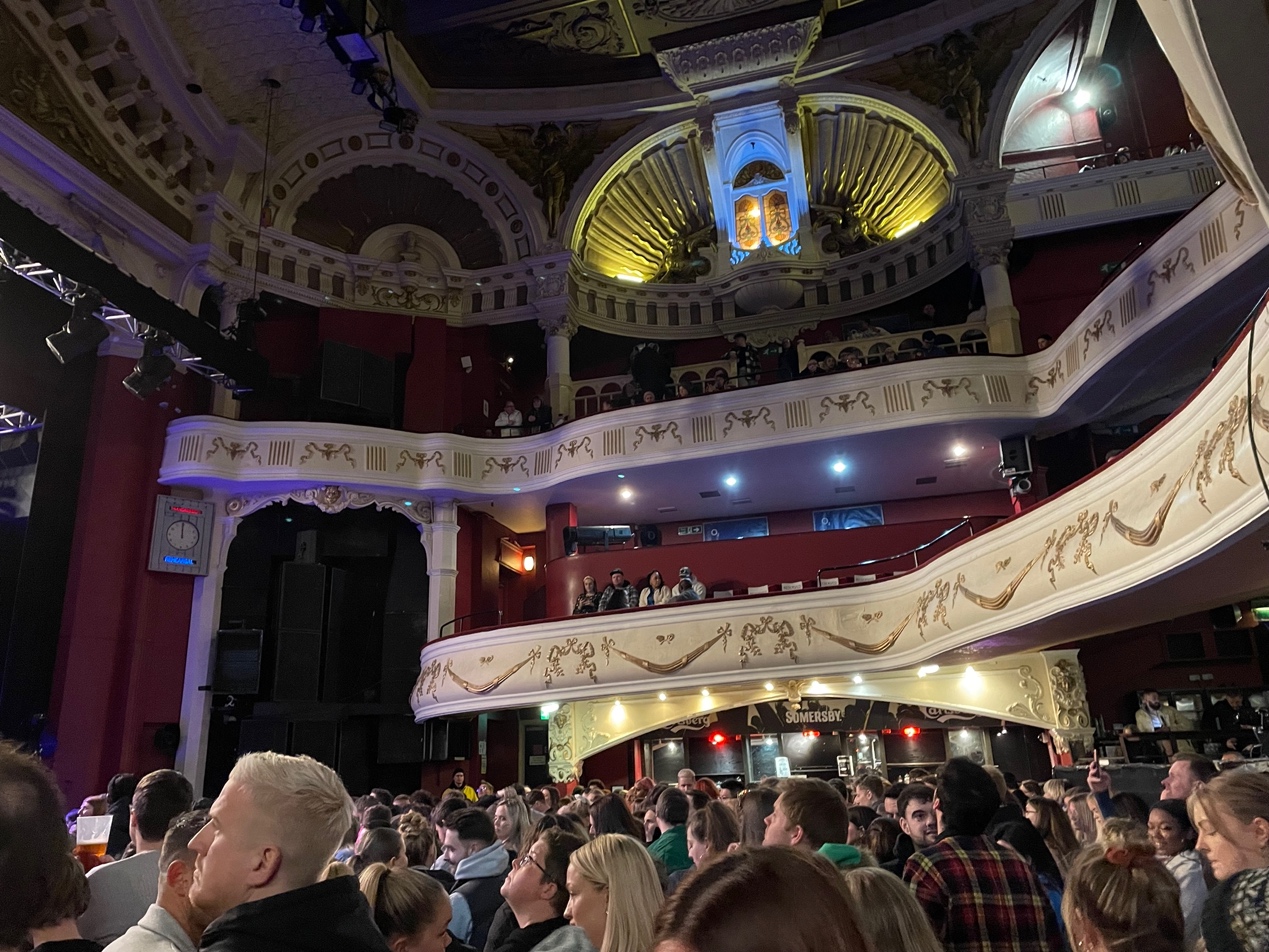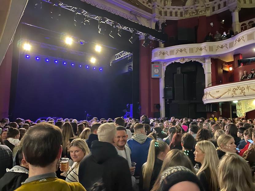 大概過了晚上8:00,才移到劇場門口可以進入,經過一番檢查程式才能入場。 進場首先看到的是酒吧,喝酒聽歌是英國習慣。不少人要一杯啤酒,喝著啤酒、軟飲料等候著演唱會開始,神情輕鬆自然。 雖然有些擁擠,氣氛卻很歡樂。 現場沒有座位,一切安排似乎都井井有條。