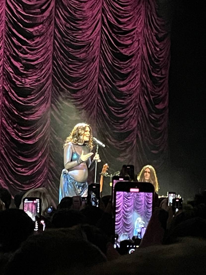 8:30,婕西· J清脆的歌聲響起,臺上卻沒人。 原來,她坐在二樓的觀眾席中歌唱,當她起身向觀眾揮手時,才發現婕西· J挺著大肚子,她是懷著身孕與歌迷們見面,開這場演唱會的。