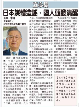 日本經濟新聞,簡稱「日經」,創立於一八七六年,是以經濟新聞和評論為主體的全國性新聞,至今已有近一百五十年歷史,是日本第五大報業集團。令人訝異的是,「日經」居然在沒有任何佐證資料或經查證之下,妄下離譜定論,不但嚴重損害自己報格,更傷害我國軍聲譽。此等卑劣行徑,令人痛心疾首。