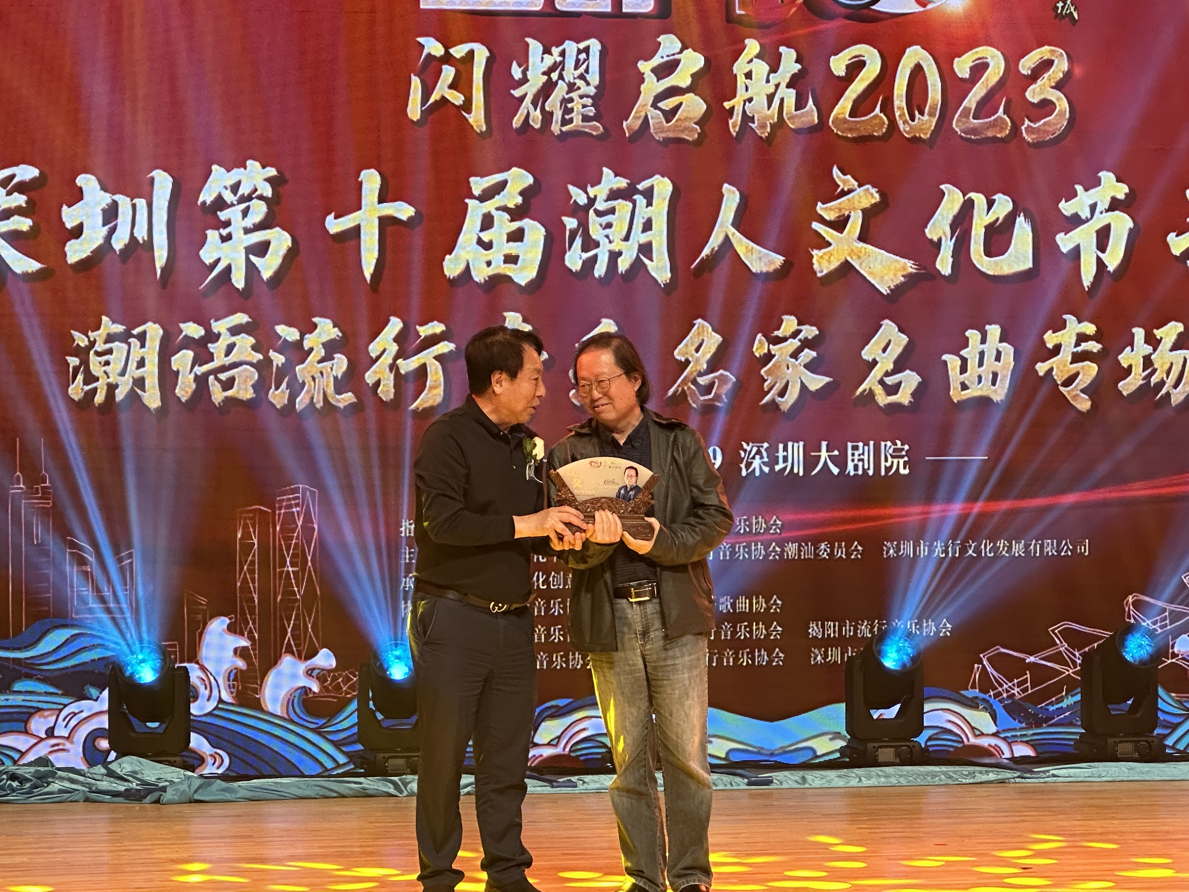 今年恰逢深圳第十届潮人文化节,潮人文化节特别企划了“寻找潮人中最美榜样”环节,当晚的演出现场,主办方的主礼嘉宾给陈小奇、林伟文、陈来发三位潮汕籍为潮汕文化做出突出贡献的艺术家颁发了荣誉纪念奖项。