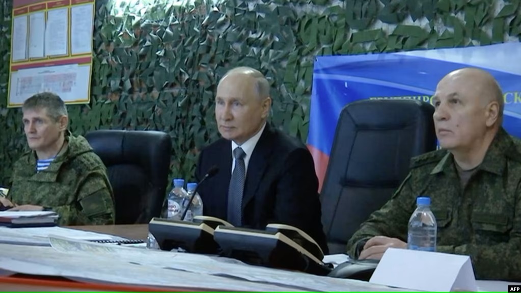 克里姆林宮公佈並由俄羅斯國家電視台播放的視頻顯示,普京乘直升機抵達俄軍在烏南赫爾鬆地區的指揮部,隨後飛往烏東盧甘斯克地區的俄羅斯國家近衛軍的總部。