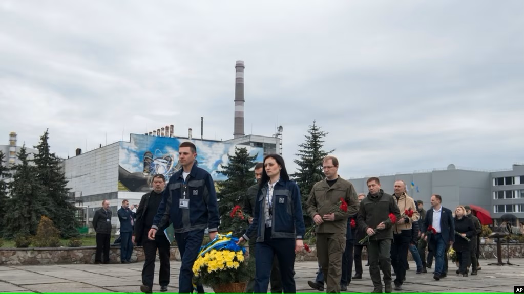 切爾諾貝利核電站的工作人員星期三在正在進行的戰爭與核威脅中紀念世界最嚴重的核災難37週年,他們嚴肅地向罹難者紀念碑獻花。