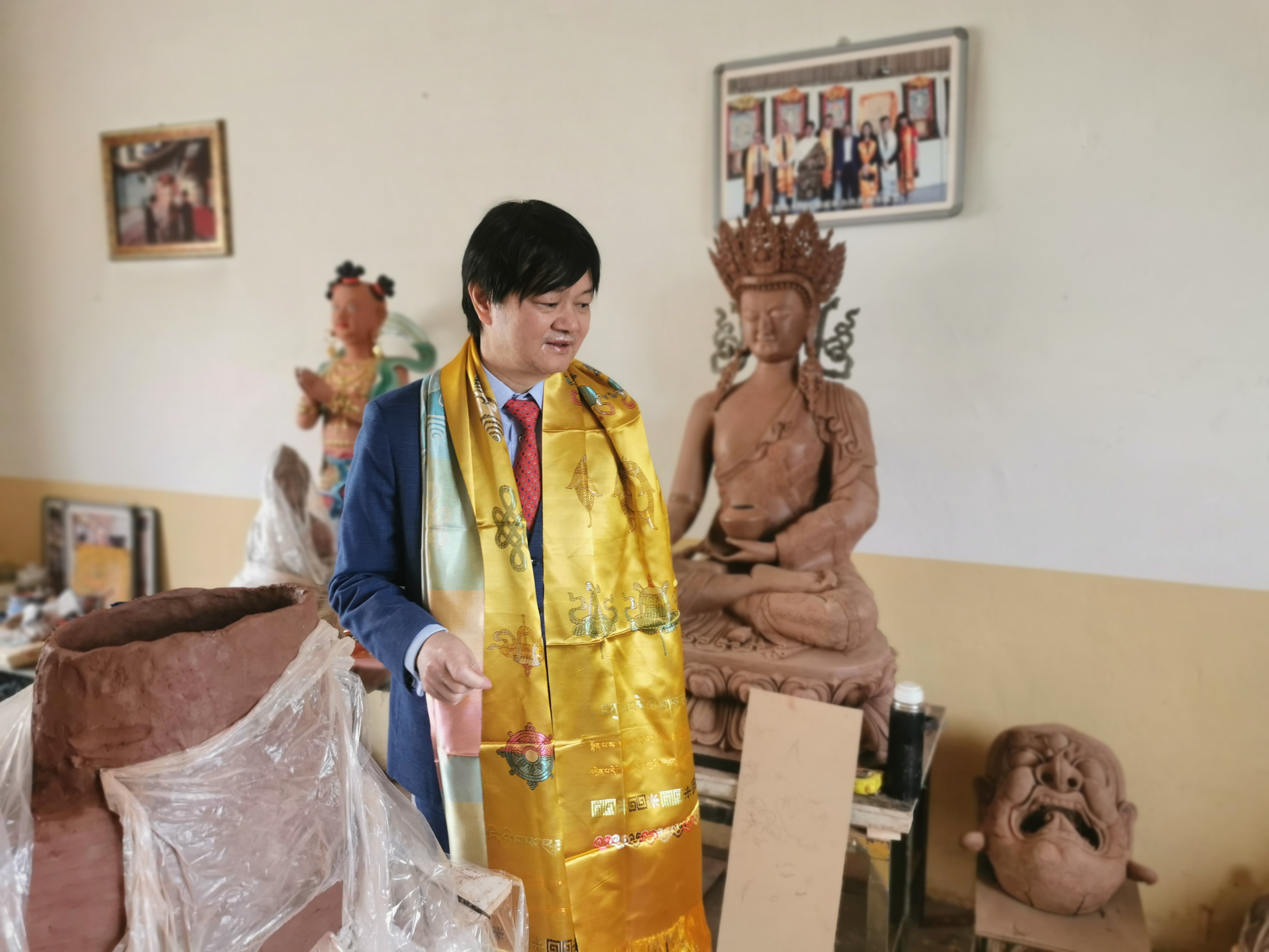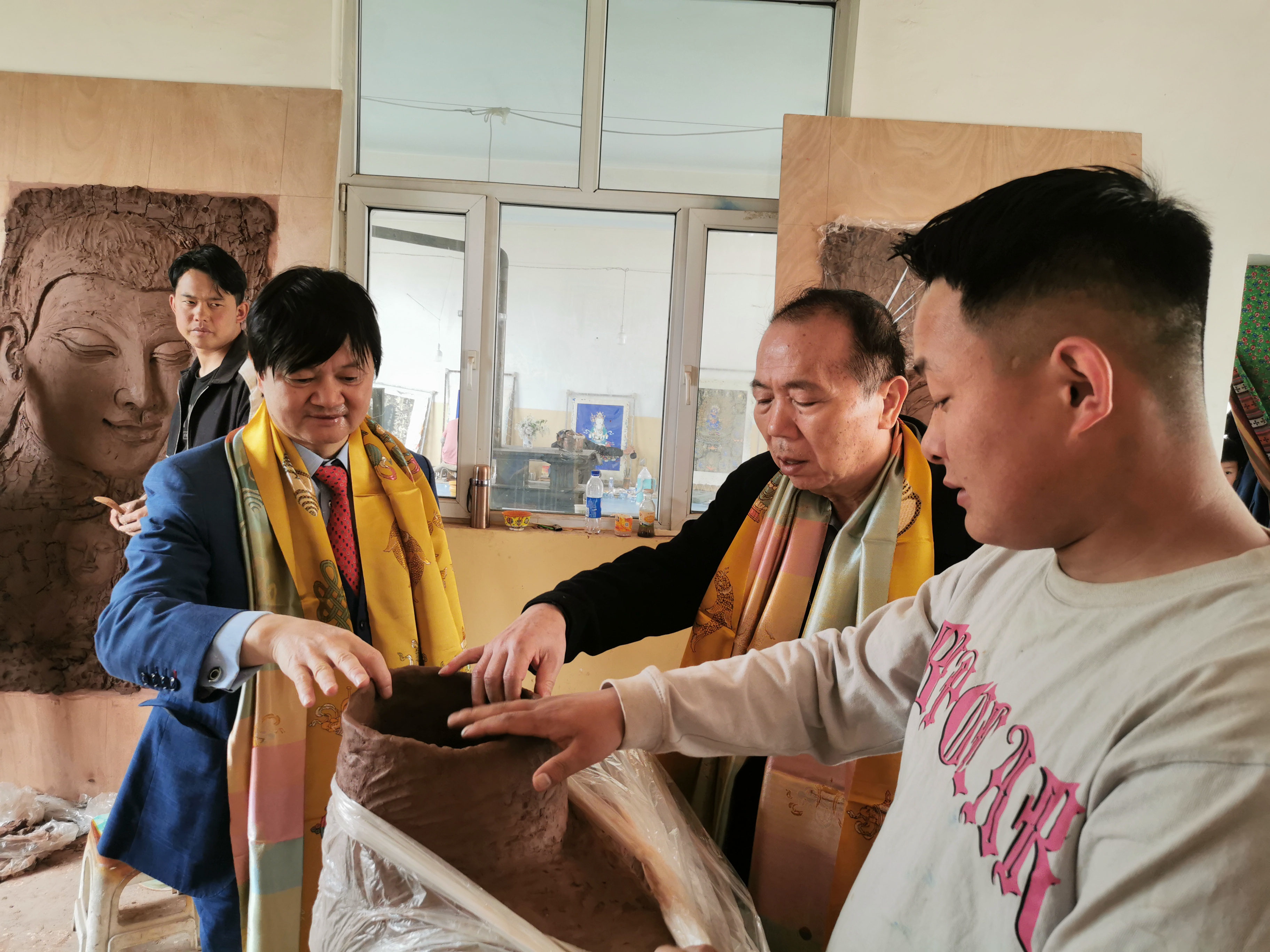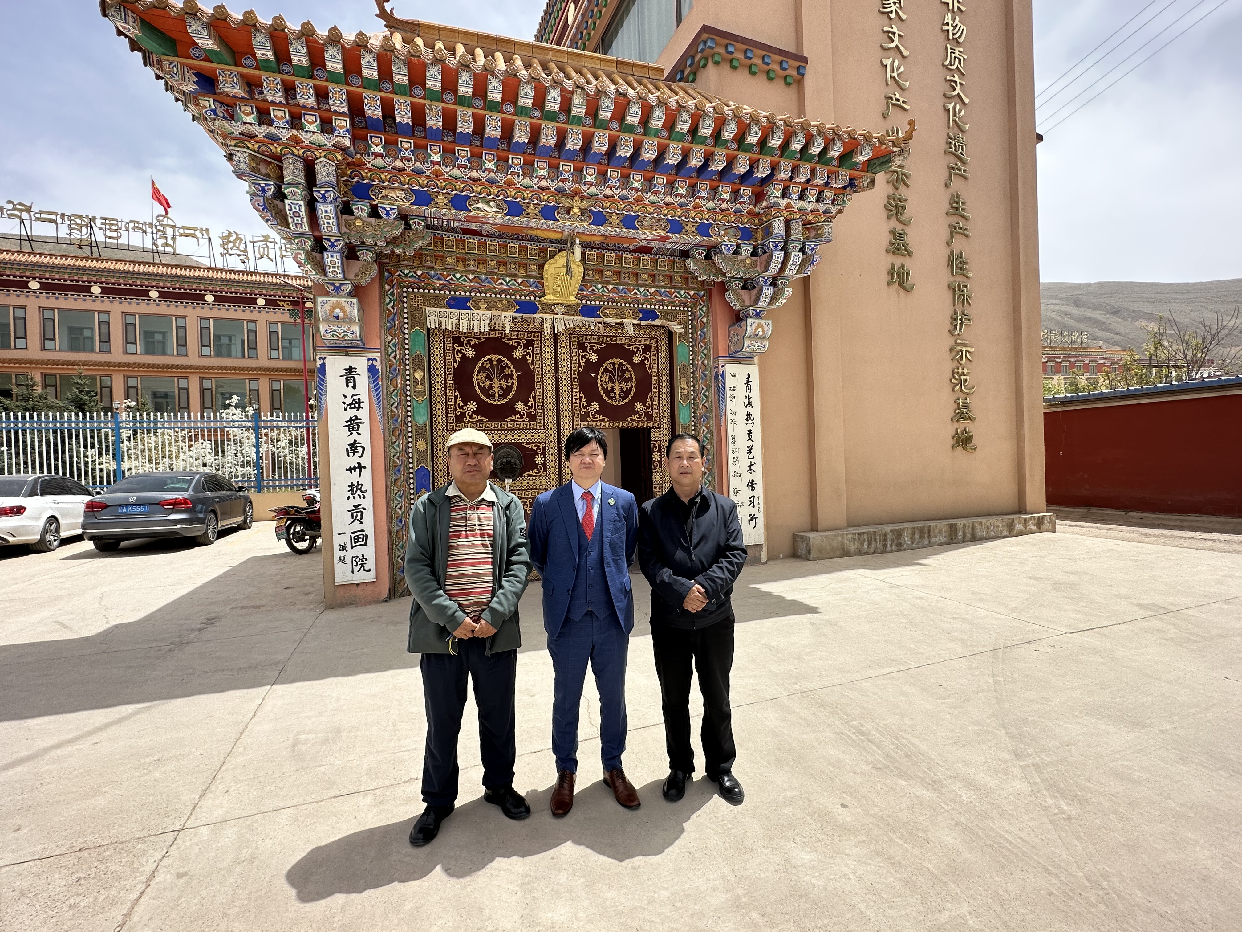 下午,曾曉輝教授一行參觀了青海省黃南州熱貢畫院,這是熱貢最大的唐卡藝術大師博物館。隨後,他們到熱貢最大的泥塑館——仁俊熱貢藝術學院參觀,並與仁俊大師進行了交流。