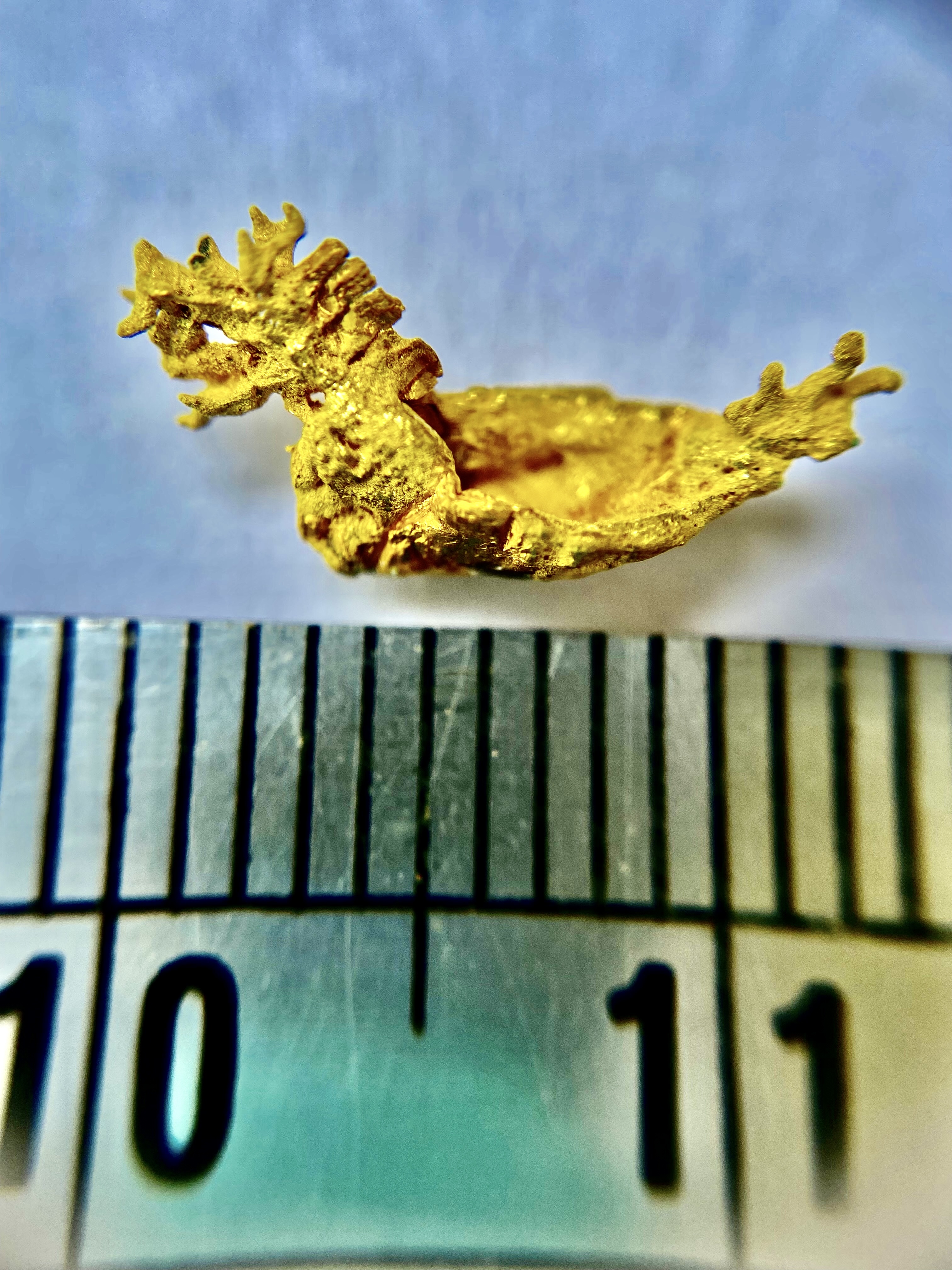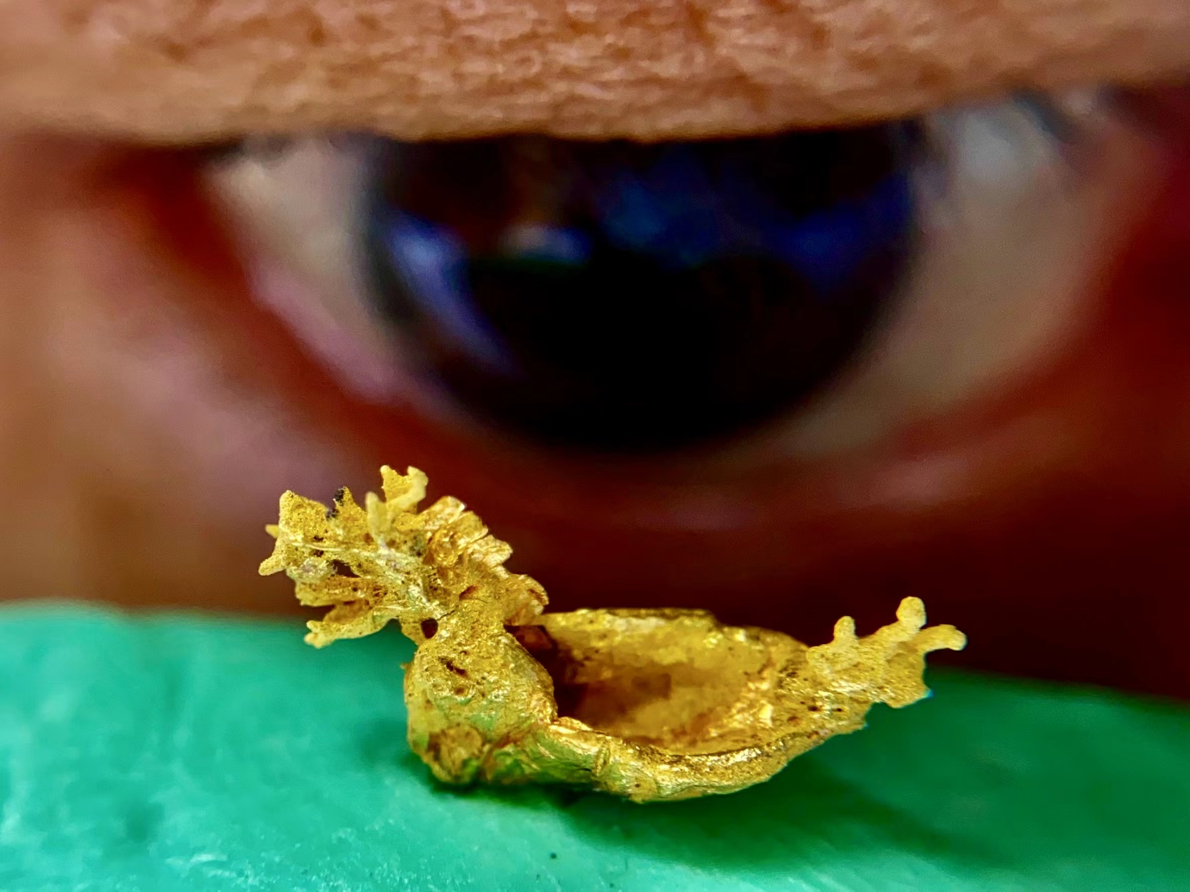 雕刻黃金龍舟,最困難的是龍頭的部分,龍頭的尺寸大約0.3公分,有明顯的雕出龍的雙角、龍鬚、眼睛、龍嘴張開的表情,而且嘴裏面含着一顆「龍珠」,這是最困難的地方,整個龍頭表情生動,栩栩如生。