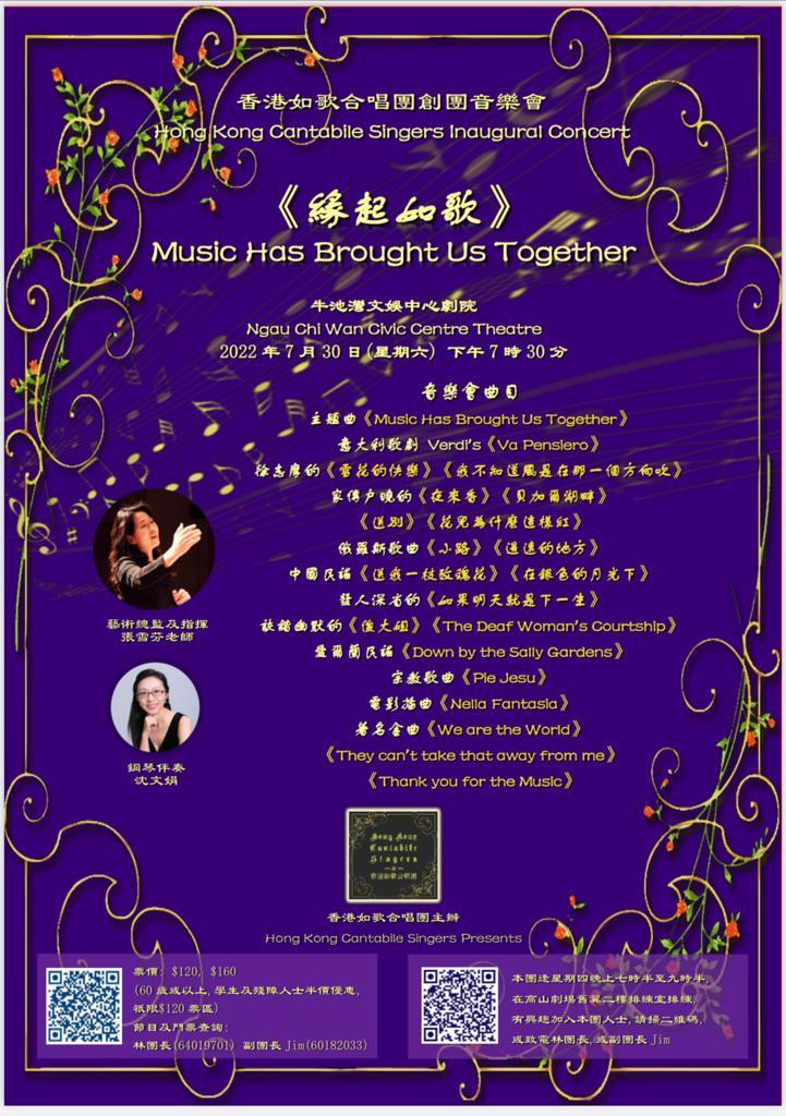 「如歌」是香港合唱團中後起之輩,慶幸憑着堅毅意志,在疫情中穩步前行,團員數目不斷增加,尤其欣慰。其曲目多元化,不論歌劇或音樂劇選曲、古今中外藝術歌曲、經典金曲或民歌,演唱時力求達致融和「美聲」,即意大利的所謂Bel Canto。日常練習中,發聲位置和技巧故然重要,氣息轉換、情感表達亦屬重點培訓。是次初試啼聲,讓團員自我鞭策、檢視學習成果,是一個期待已久的良機。