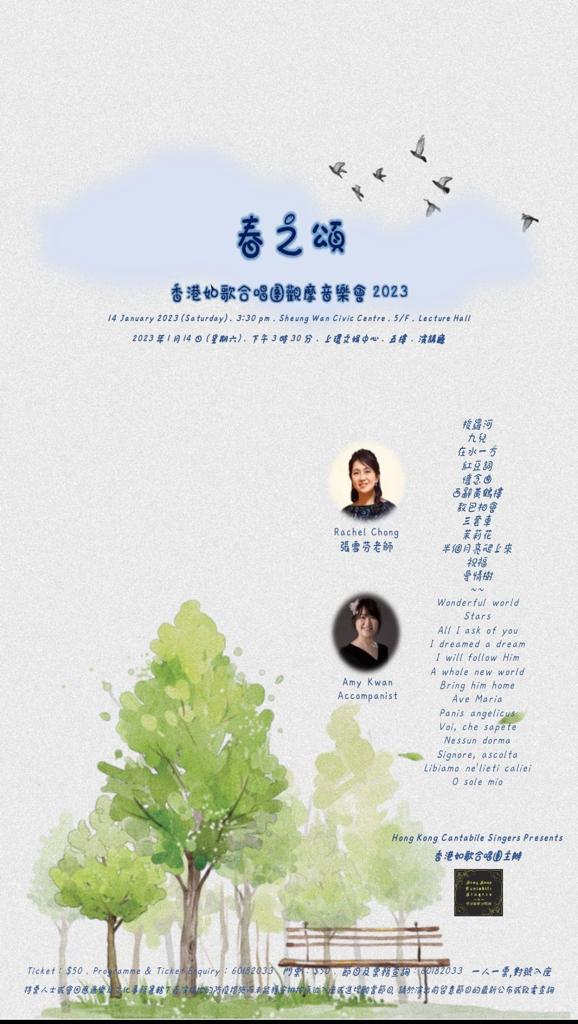 除了上述演出,政府宣布復常以來「如歌」排練更為認真,團員出席率高,又自發組成小組選練「飲歌」,意志高昂,這些都是令人鼓舞的現象。「一團一心一意一如 似詩似畫似水似歌」是我團的座右銘。衷心感謝張雪芬老師一路走來循循教導,團員戳力同心,盼望日後眾人堅守初心,在美聲合唱路上再邁進一步。