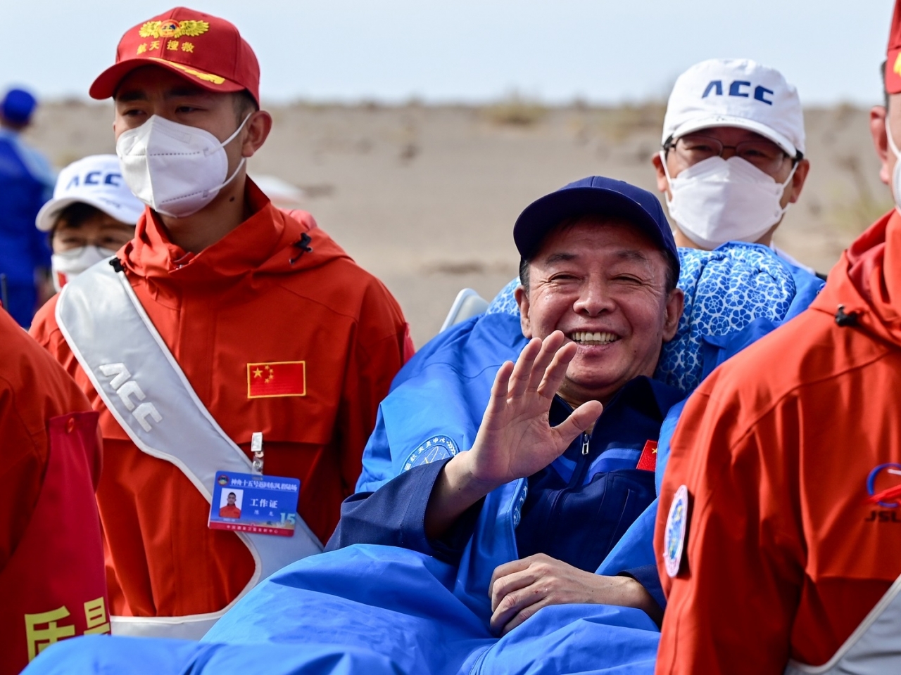 神舟十五號載人飛行任務取得圓滿成功,航天員鄧清明揮手致意。(新華社)
