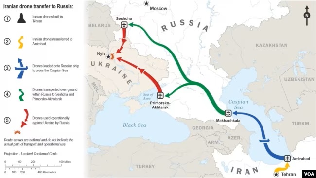 科比說,目前,這些無人機是在伊朗製造,並通過里海從伊朗的阿米爾阿巴德運往俄羅斯的馬哈奇卡拉,然後被俄軍用於攻擊烏克蘭。