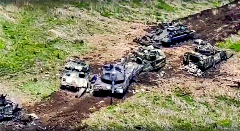 俄國國防部九日公布的影像顯示,烏軍戰車與裝甲車在反攻行動中被擊毀棄置。由於烏南地形多平原,烏軍推進時容易遭到鎖定,體積龐大的戰車尤其容易成為攻擊目標。(美聯社)