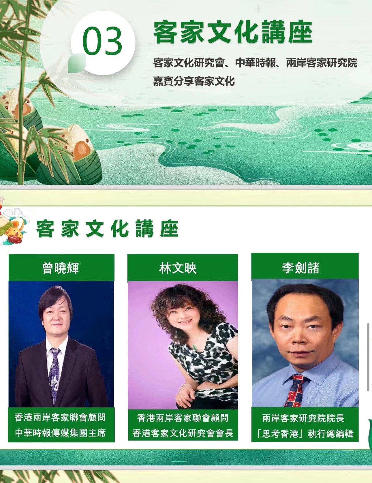 本次活動還特別邀請了多位客家文化領域的專家,包括香港兩岸客家聯會顧問、香港美術學院院長曾曉輝教授、香港兩岸客家聯會顧問、客家文化研究會會長林文映,以及兩岸客家研究院院長李劍諸等,分別就客家文化、歷史、傳統習俗等方面進行了生動有趣的講解,獲得了聽眾的一致好評。特別是曾曉輝與大家分享了他近期發表的文章「「客家文化如何形成,到底什麼是客家文化——客家文化輕地域歸屬,重人文內涵」,引起了現場聽眾的廣泛關注和熱烈討論。