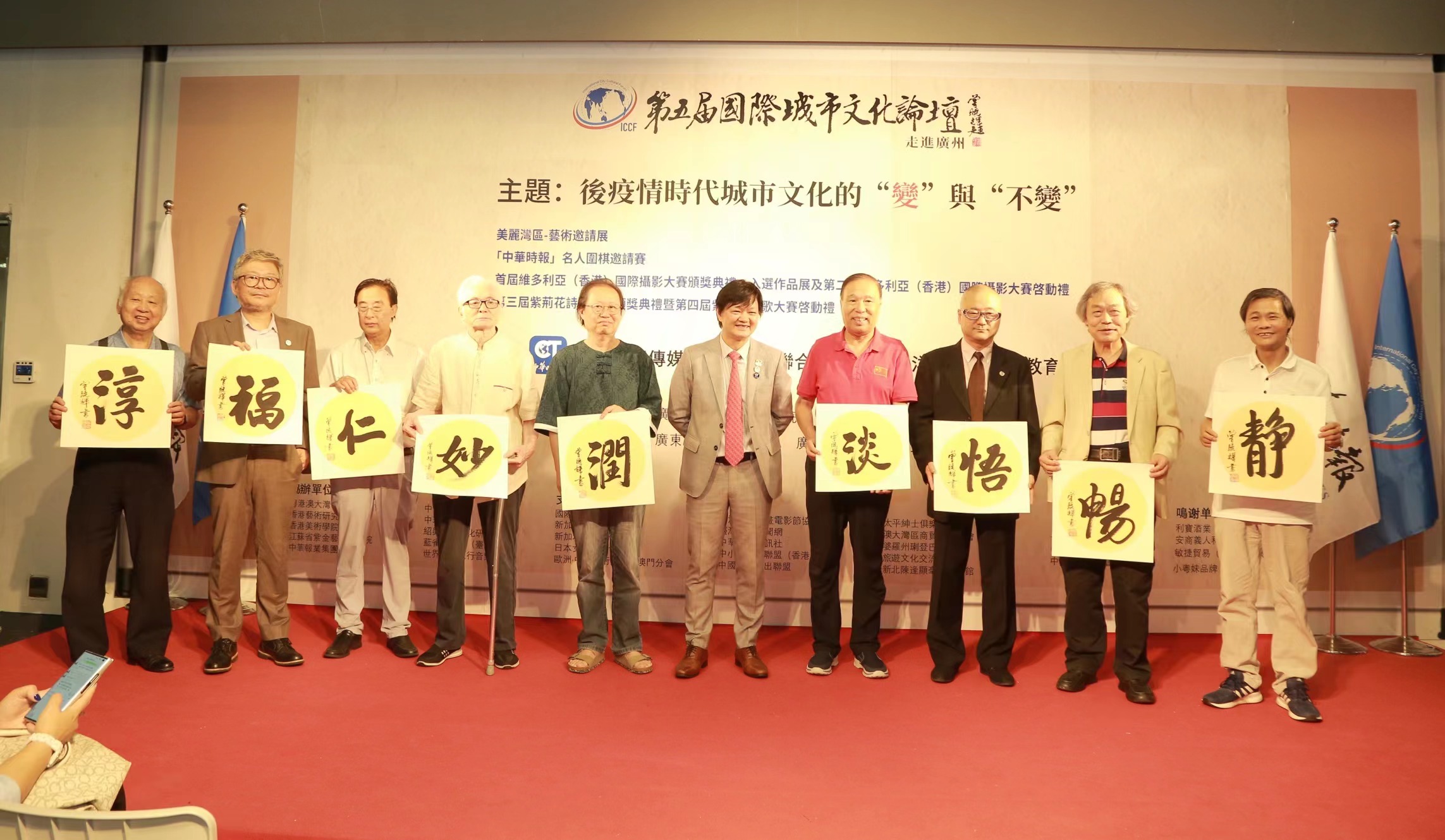 囯際城市文化論壇組委會主席、中華時報傳媒集團主席、香港藝術研究院院長、香港美術學院院長曾曉輝教授(左6)贈送他題寫的書法給主禮嘉賓留念。