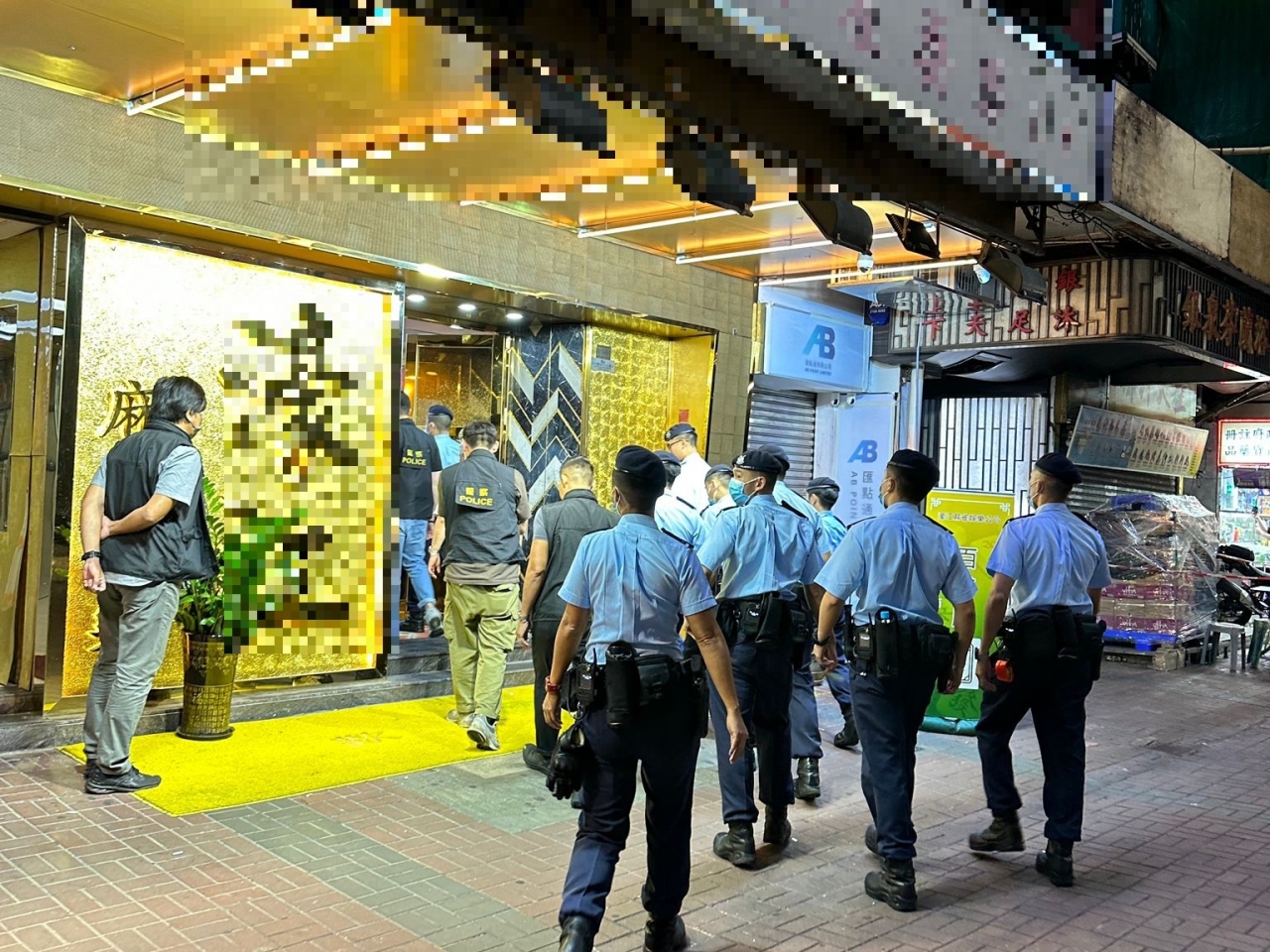 人員搜查旺角7個住宅及商業單位,搗破兩個懷疑非法釣魚機賭場、一個懷疑毒窟、一個懷疑賣淫場所、兩個懷疑色情光碟分銷中心及一個懷疑武器倉庫。
