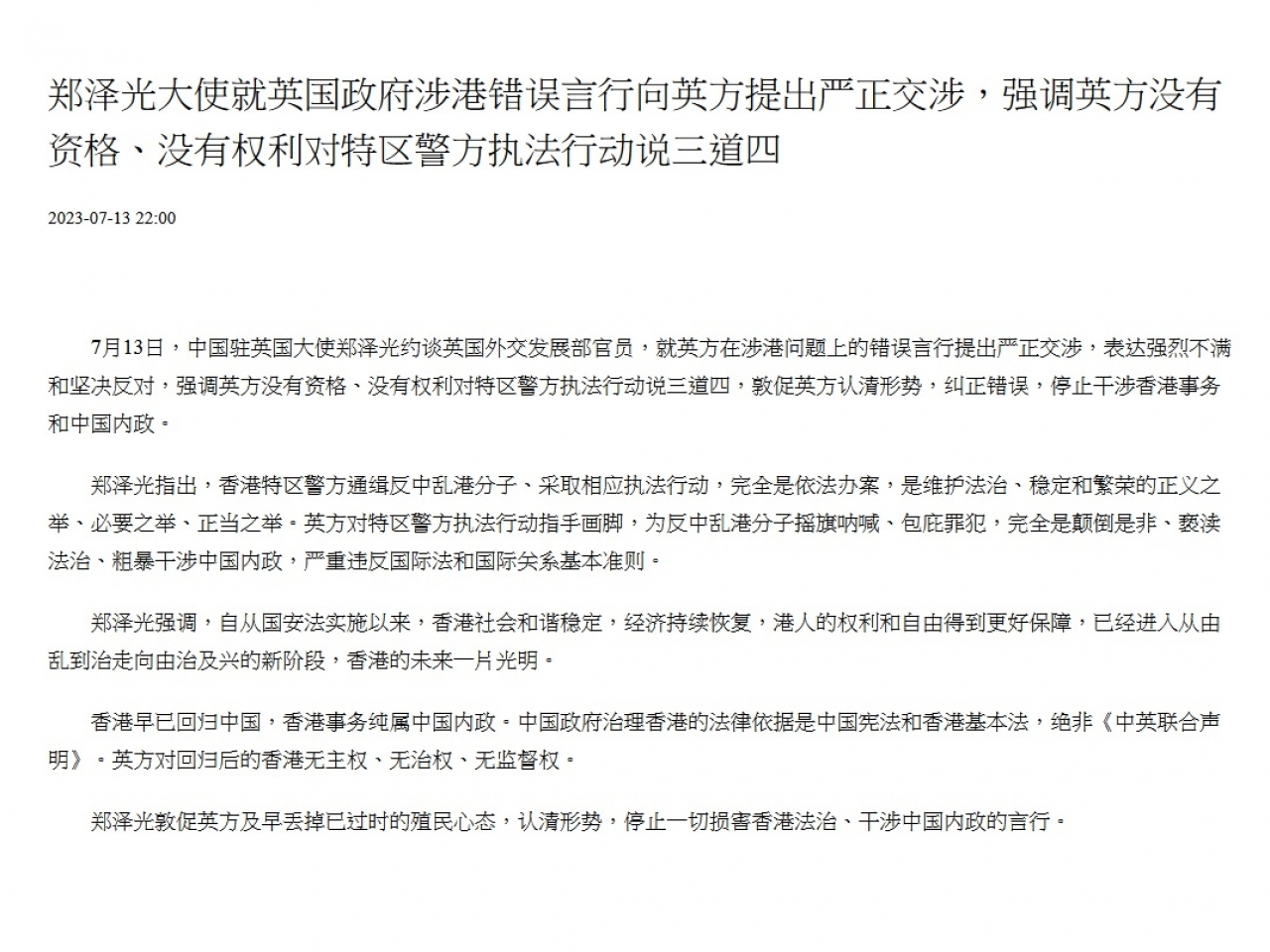 中國駐英國大使鄭澤光約談英國外交部官員,就英方在涉港問題的錯誤言行提出嚴正交涉,表達強烈不滿和堅決反對,強調香港警方通緝反中亂港分子、採取相應執法行動,完全是依法辦案。