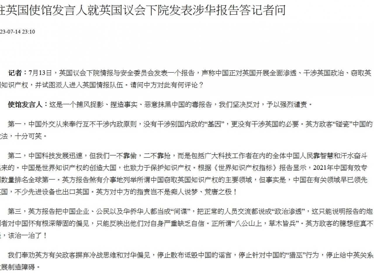 中國駐英國大使館批評報告捏造事實、惡意抹黑中國,表示堅決反對,予以強烈譴責。發言人說,中國外交從來奉行互不干涉內政原則,沒有干涉別國內政的基因,更沒有干涉英國的必要。