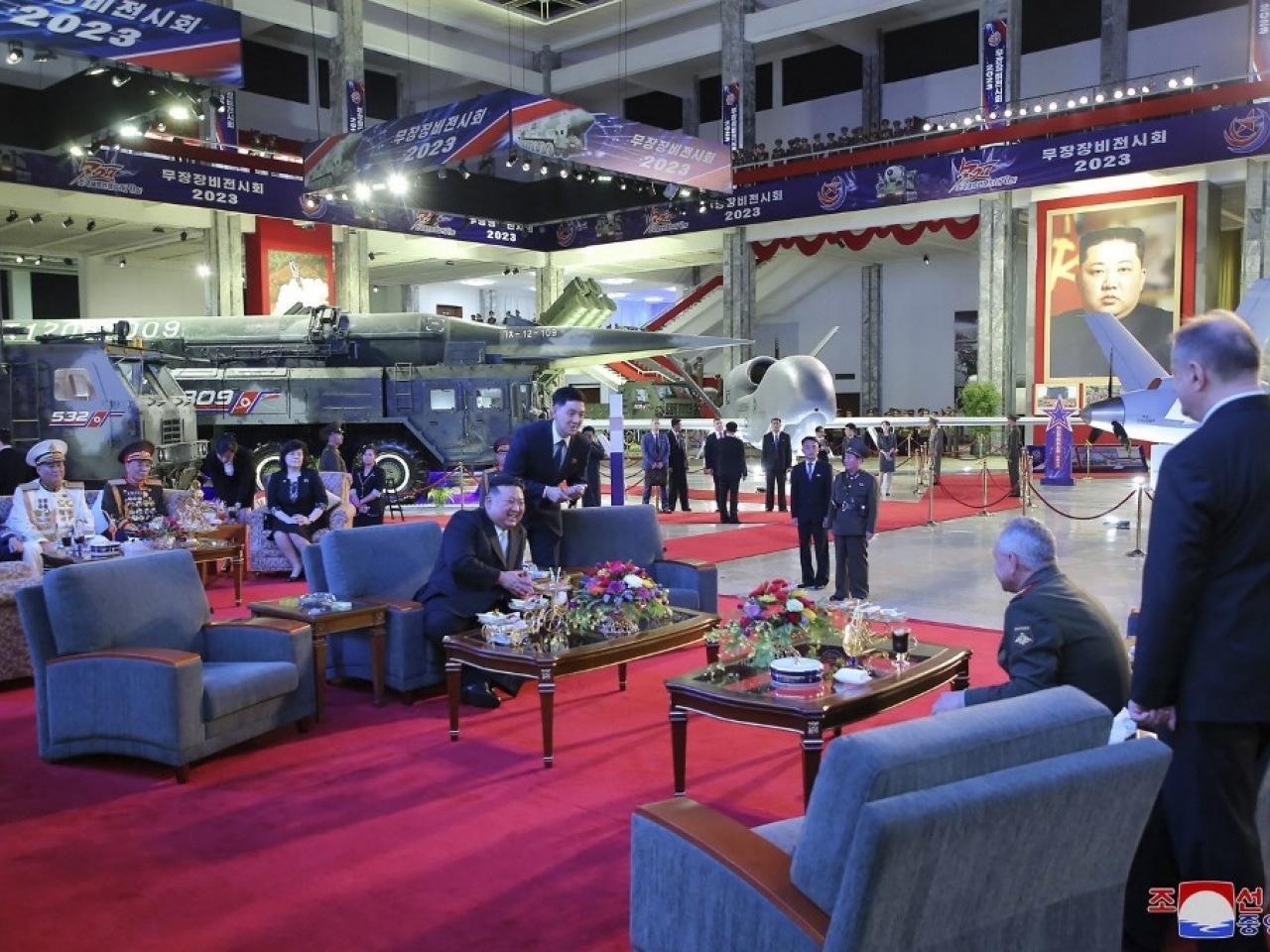 (中華新聞通訊社/中華時報7月27日訊)北韓領袖金正恩同俄羅斯國防部長紹伊古一同參觀北韓的武器裝備展覽。展覽展示部分北韓新型武器。