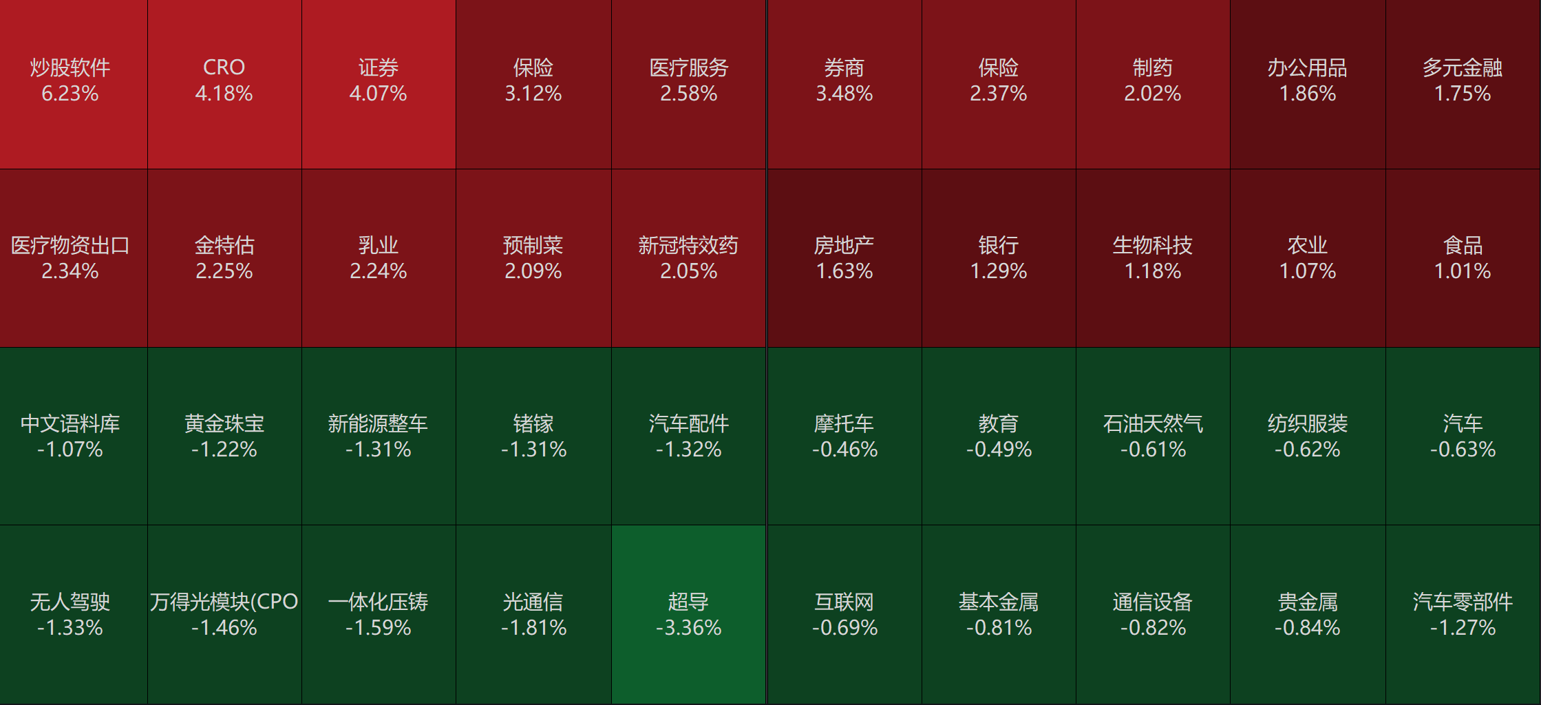 【記者張天威/上海報導】 週四(8月3日),A股低開震盪後下午盤全線反彈,大金融繼續充當先鋒,多隻券商股漲停;日內白馬股估值修復也在同步上演,醫藥、光伏相對強勢。板塊方面,CRO、證券、食品加工、房地產等板塊漲幅居前,超導概念、有色金屬、汽車零部件、汽車整車等板塊跌幅居前。