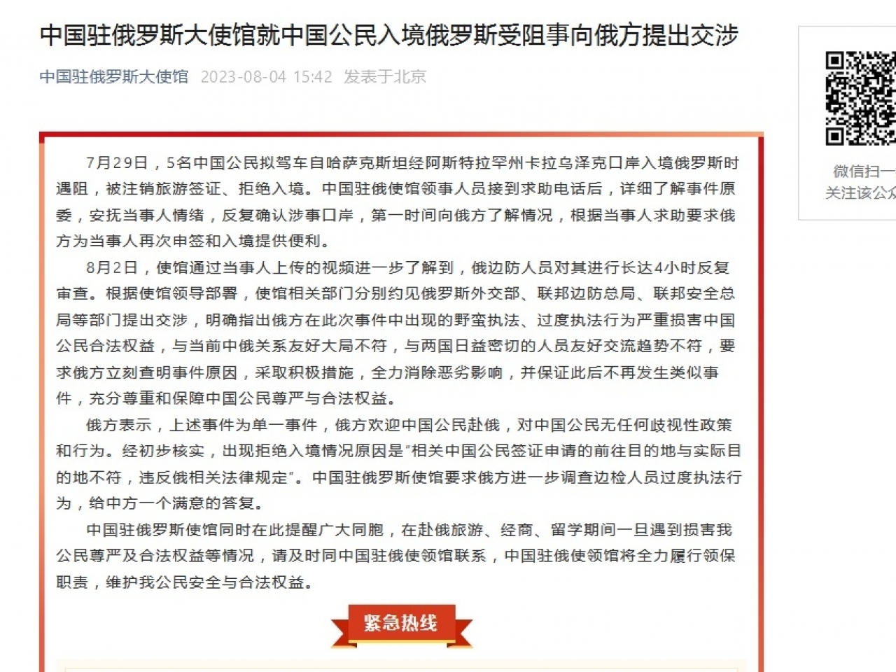 中國駐俄大使館表示,5名中國公民上月29日打算駕車從哈薩克入境俄羅斯時,被註銷旅遊簽證及拒絕入境。使館從影片了解到,俄方邊防人員對他們反複審查達4小時,使館相關部門分別約見俄羅斯外交部、聯邦邊防總局等部門提出交涉,指出俄方的野蠻和過度執法行為,嚴重損害中國公民合法權益,不符合中俄關係友好大局,以及兩國日益密切的人員友好交流趨勢。