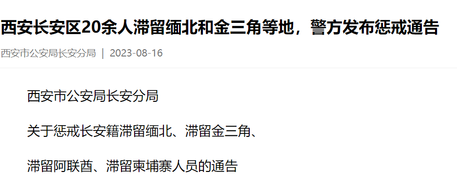 西安公安局長安分局8月14日發布的通告令顯示,官方打擊的主要對象是 “滯留緬北”、“滯留金三角”,“滯留阿聯酋”,“滯留柬埔寨人員”。那麼,他們的罪行是什麼,當局沒有提任何具體事實。“滯留”為什麼涉罪? 並不清楚。公安局將他們一律稱之為“涉詐高危人員”。
