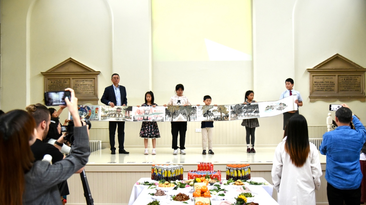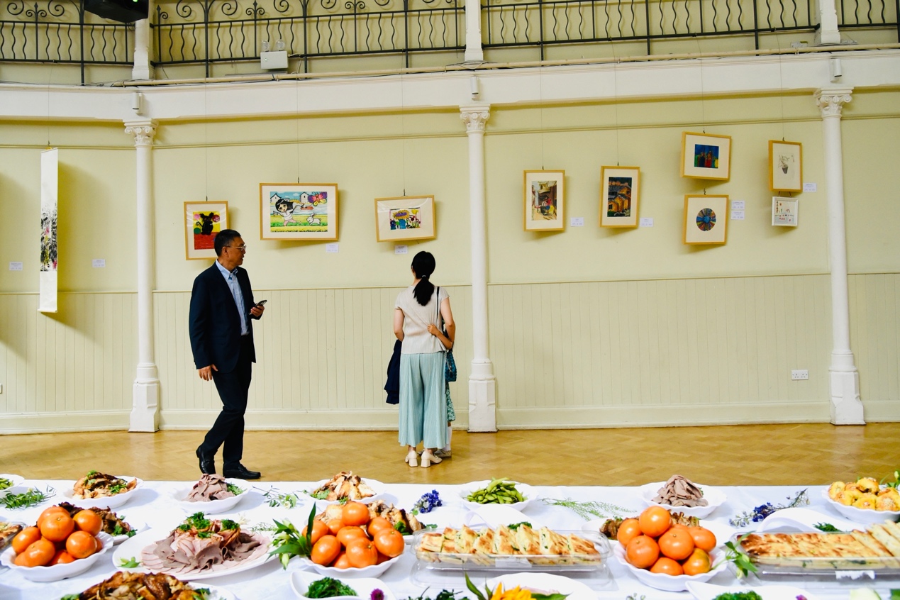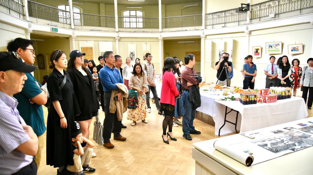 現場,倫敦的浦梓煊和來自中國北京的胡峻浩小畫家共同為嘉賓們作了導賞。 有5位少兒創作的一幅體現長三角風貎的長卷,吸引了來賓們的關注。
