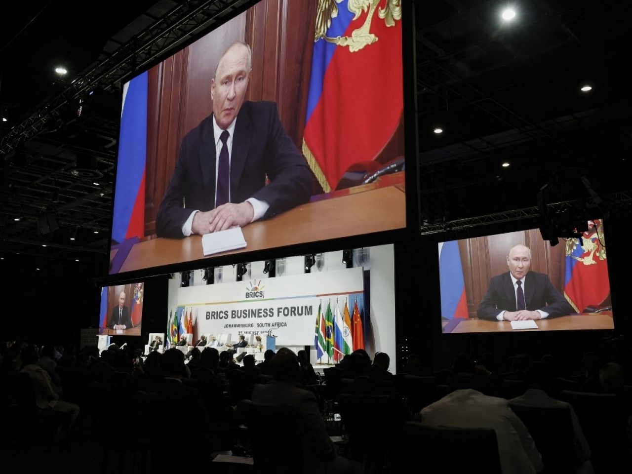 普京以視頻方式向金磚國家工商論壇致辭。(法新社)